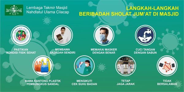 NU CILACAP ONLNE – Pelaksanaan Protokol Kesehatan Masjid Nur Tjokrosiwojo Diterapkan sejak pelaksanaan Shalat Jumat, 12 Juni 2020. Masjid milik PCNU Cilacap ini, adalah Masjid Wakaf yang dibangun di atas tanah Wakaf Bersama milik Pengurus Cabang Nahdlatul Ulama Cilacap.